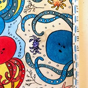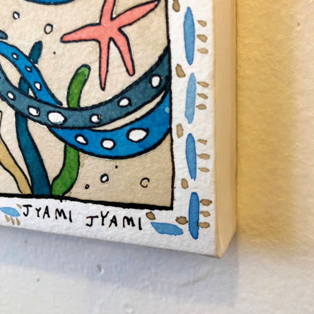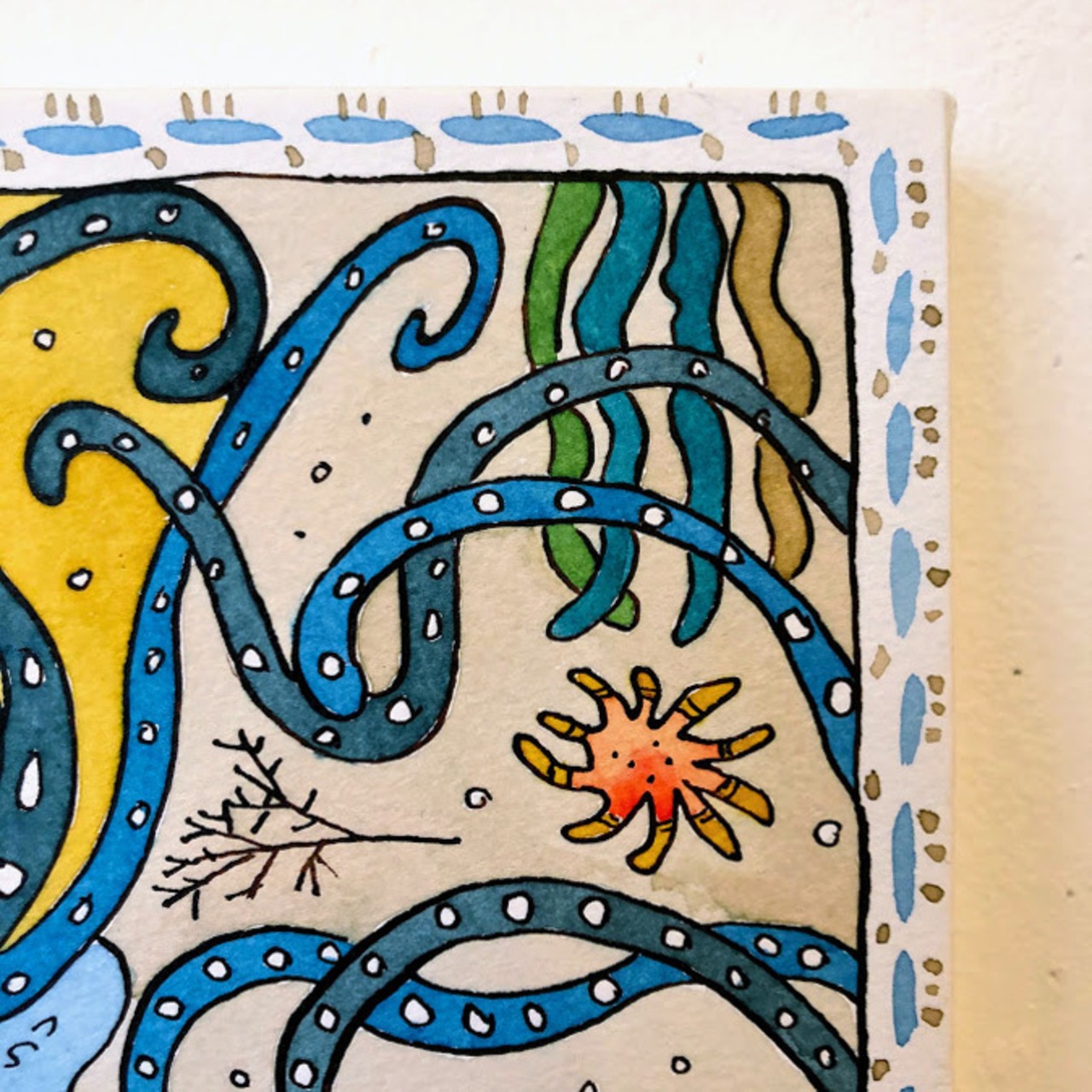 四角の紙の中に日常と生き物、模様をよく描きます。