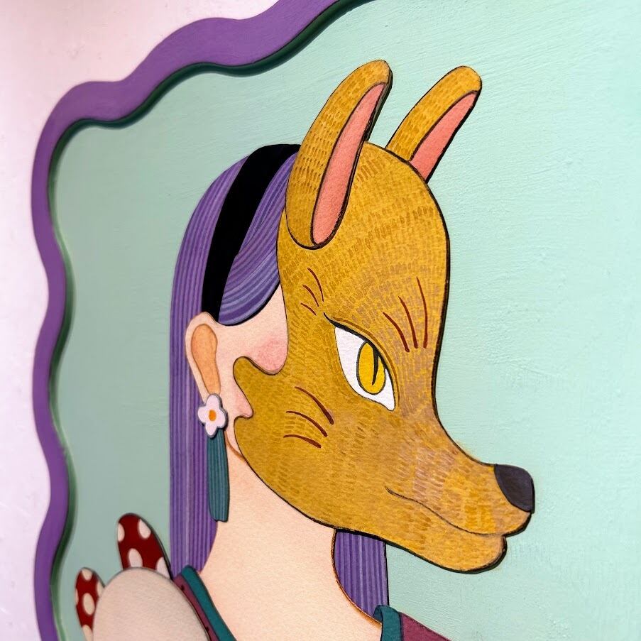 感情の波をイメージしたパネルにお面をつけた女の子たちを入れてみたら、 一人ひとりが嵌りそうで嵌まらないパズルのピースみたいになった。