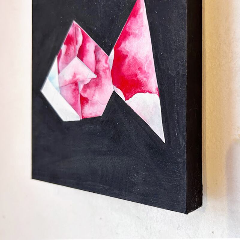 立葵を描き、印刷した和紙で出目金を折り描く。
